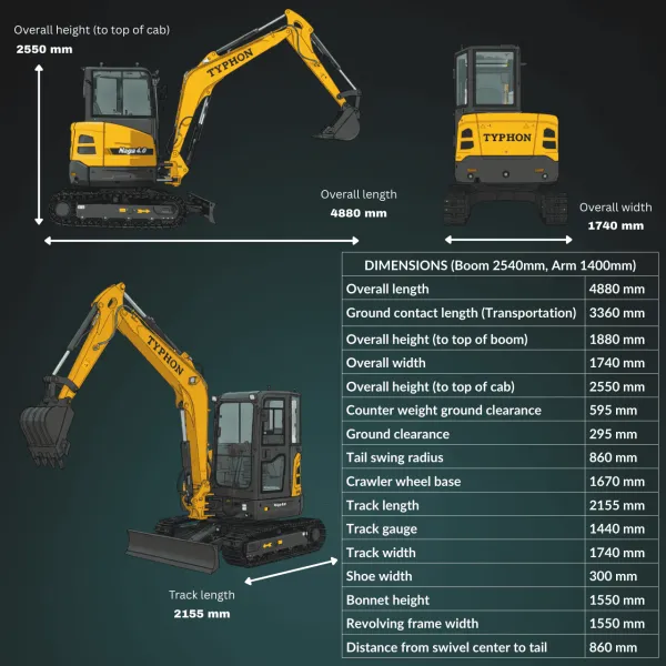 The TYPHON NAGA 4.0 Mini Excavator is a powerful 4-ton compact machine built for urban construction and confined job sites. Its zero-tail swing design, 360Β° rotation, and compact dimensions allow safe and efficient operation in tight spaces while maintaining excellent stability.