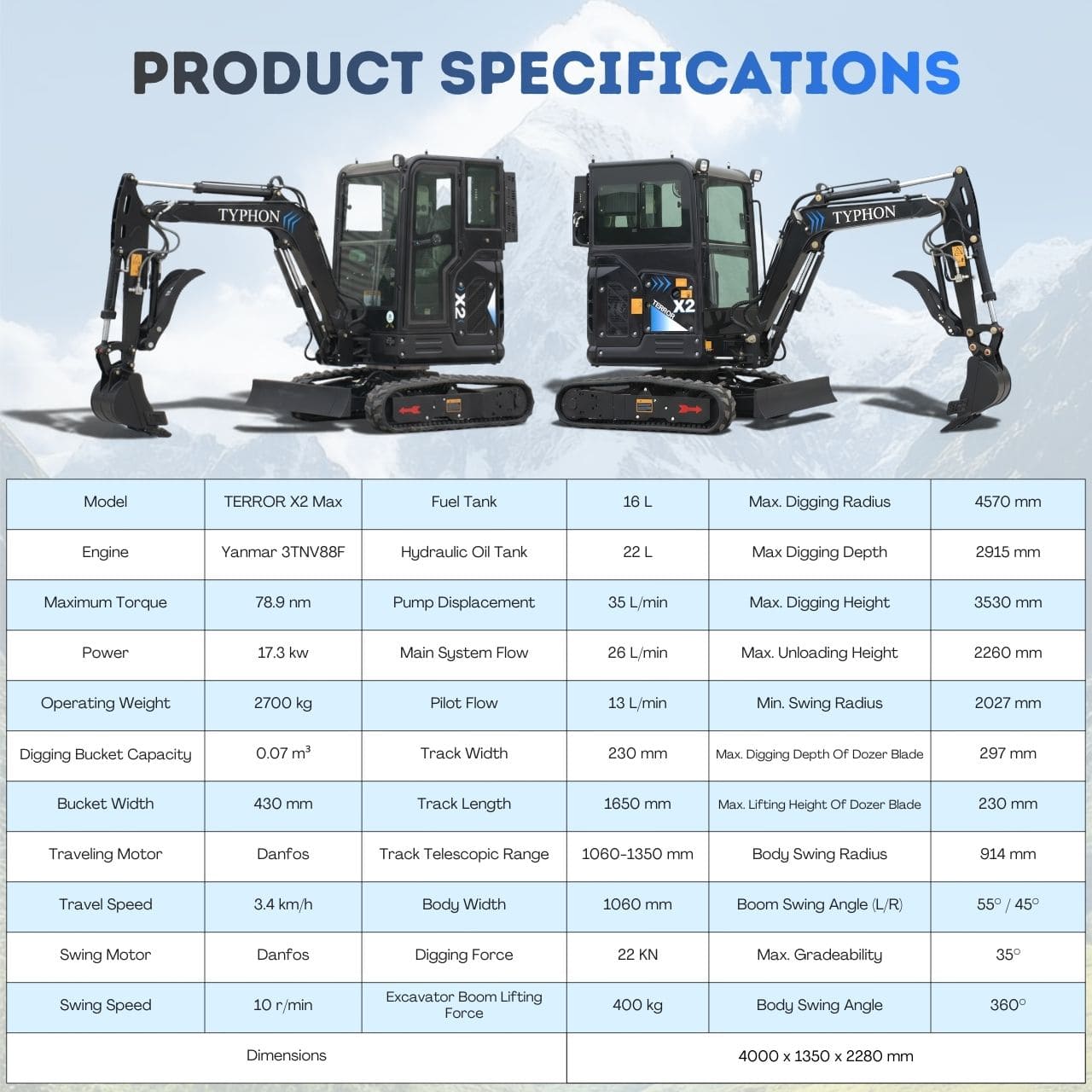 The TYPHON TERROR X2 MAX Mini Excavator is a compact and powerful 2.7-ton machine designed for precision work in tight spaces. Powered by the reliable Yanmar 3TNV88F diesel engine, it delivers strong digging performance, smooth hydraulic operation, and excellent fuel efficiency.